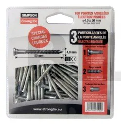 CNA galvanisch verzinkte Kammnägeln werden für strukturelle Montagen von Simpson Strong-Tie Verbindern empfohlen. Alle unsere Tests wurden mit dieser Art von Nägeln durchgeführt. Für mehr Rückverfolgbarkeit auf den Baustellen sind sie mit einem ≠-Stempel versehen, eine Qualitätsgarantie ohnegleichen.