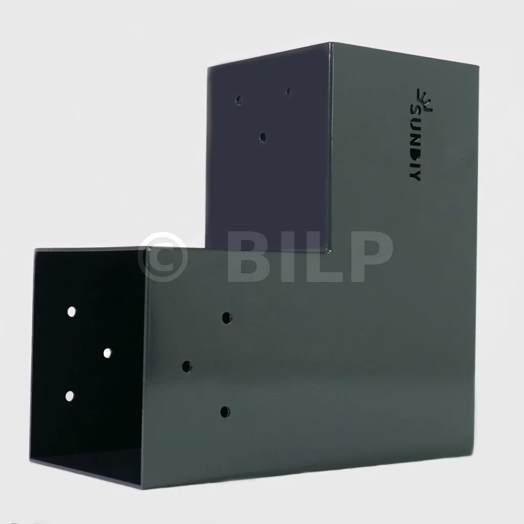 Es wird in einer Außenecke verwendet. Mit diesem Verbinder können Sie einen 90 x 90 mm großen Balken senkrecht mit einem anderen Balken oder mit einem 90 x 90 mm großen vertikalen Pfosten verbinden.