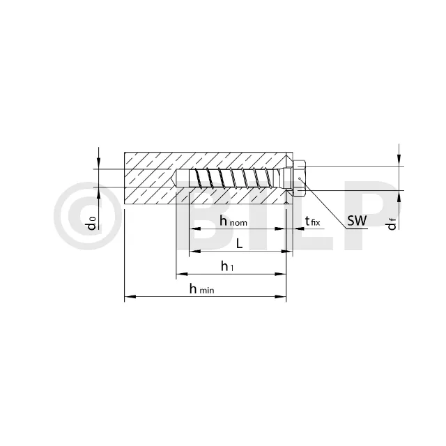 - Schraube zum Einsetzen ohne Dübel in ein vorgebohrtes Loch. Der Durchmesser der Bohrkrone zum Vorbohren wird im Merkmal "Nenndurchmesser der Bohrkrone, d0" angegeben.