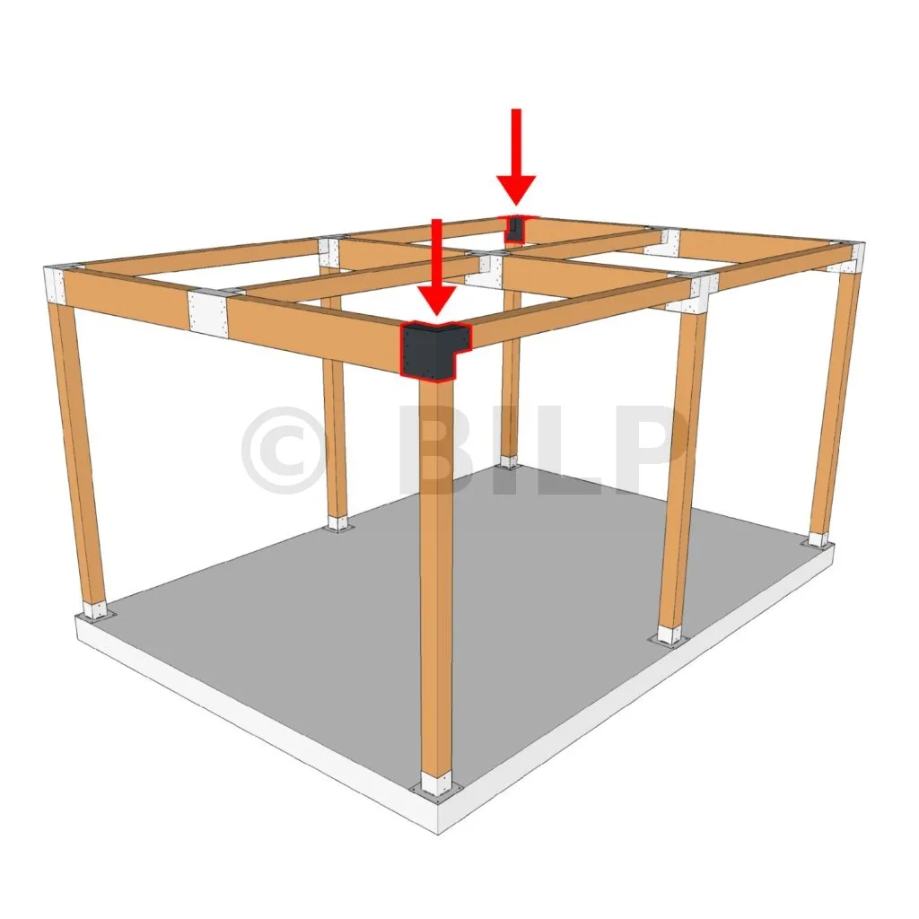 Es wird in einer Außenecke verwendet. Mit diesem Verbinder können Sie einen großen Balken von 240 x 120 mm senkrecht mit einem Balken von 120 x 120 mm verbinden, wobei das Ganze von einem vertikalen Pfosten von 120 x 120 mm getragen wird.