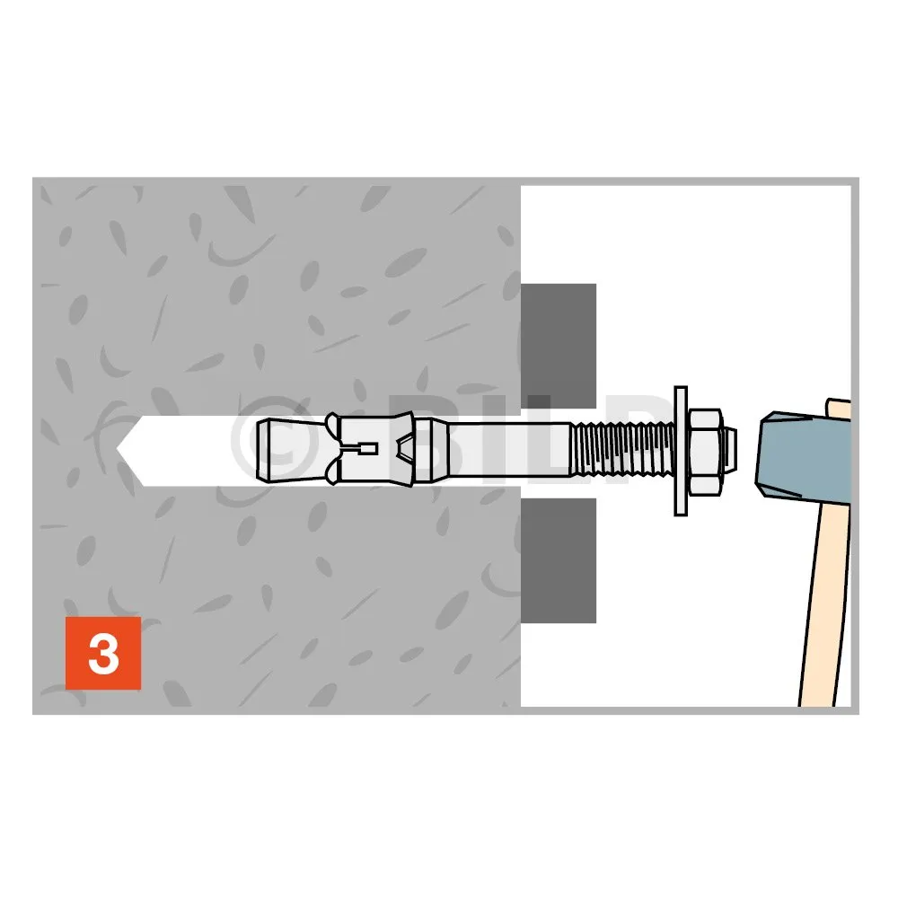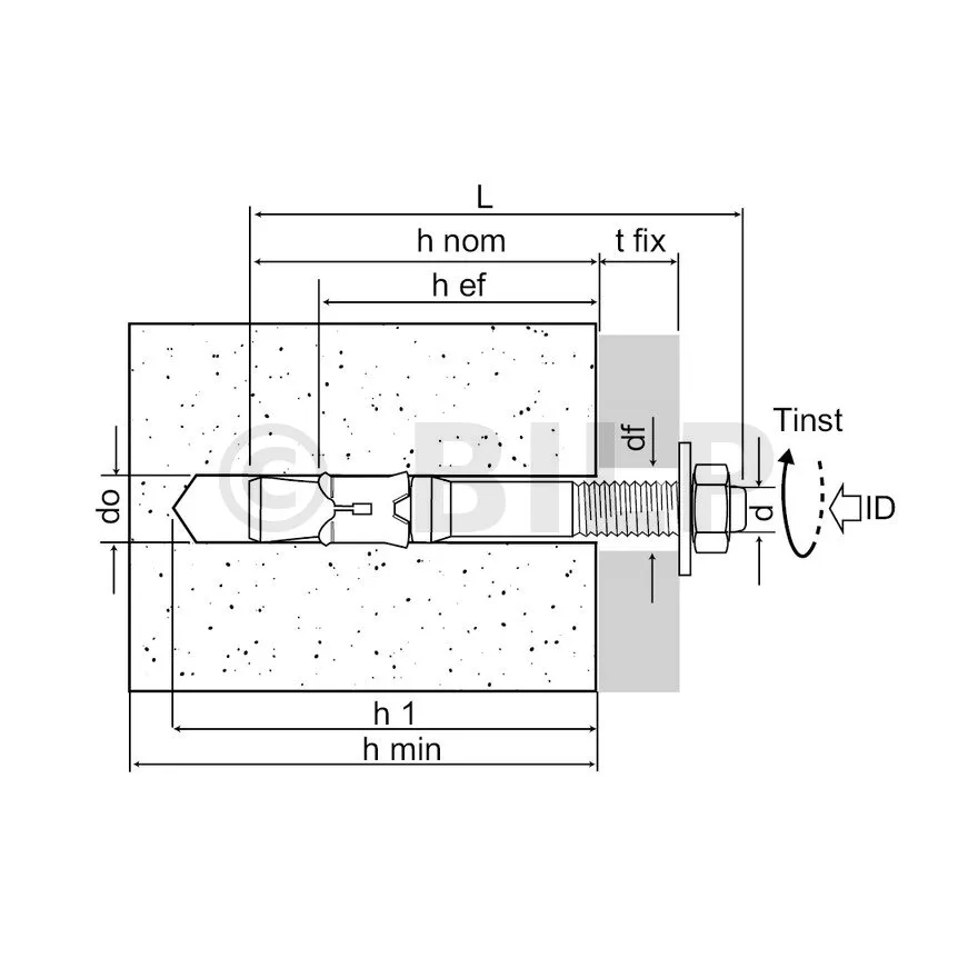 | Referenzen | Produktreferenz | Abmessungen [ØxL] [mm] | Bohr-Ø [d0] [mm] | Prof. min. Bohrtiefe [h1] [mm] | Ø Bohrung im zu befestigenden Teil (durchgehend) [df] [mm] | Schlüsselweite an der Fläche [SW] [mm] | Anziehen Drehmoment [Tinst] [Nm] | Prof. Verankerung [hef] [mm | Ep. Mindestauflage [hmin] [mm] |