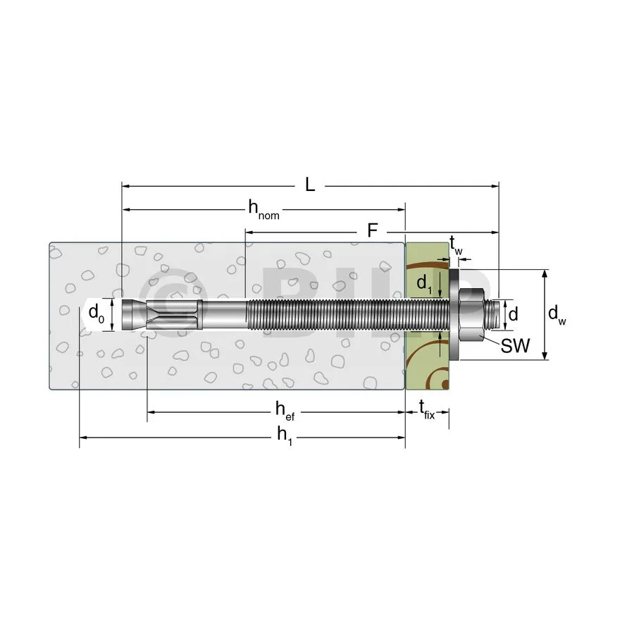 - Einfache und schnelle Installation: vormontierte Mutter und Unterlegscheibe und reduzierte Verankerungstiefe; Ø Gewinde = Ø Bohrung,