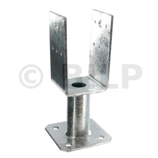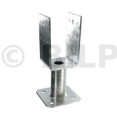 Dieser U-Pfostenträger mit Bodenplatte ermöglicht die Befestigung eines Pfostens auf einer Betonplatte und hält dabei Kräften in allen vier Richtungen stand.