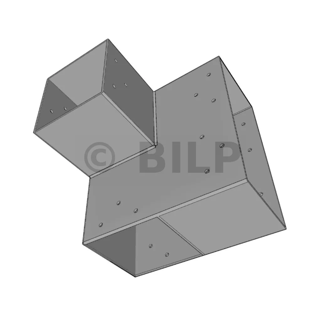 Es wird in einer Außenecke verwendet. Mit diesem Verbinder können Sie einen großen Balken von 240 x 120 mm senkrecht mit einem Balken von 120 x 120 mm verbinden, wobei das Ganze von einem vertikalen Pfosten von 120 x 120 mm getragen wird.