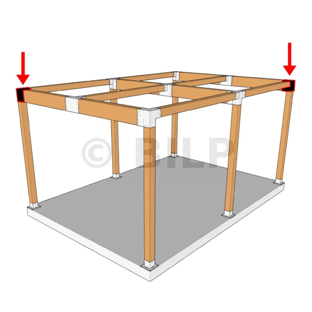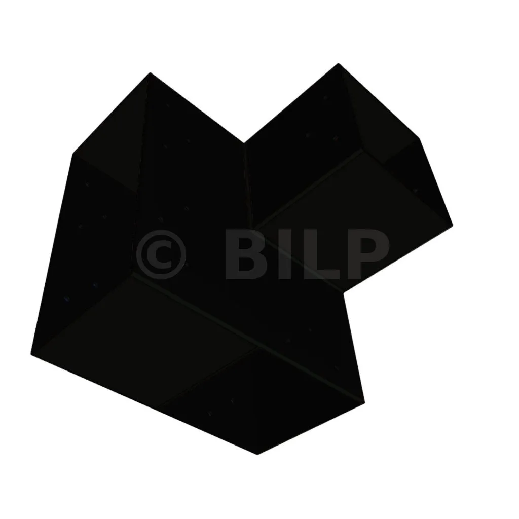 Es wird in einer Außenecke verwendet. Mit diesem Verbinder können Sie einen großen Balken von 240 x 120 mm senkrecht mit einem Balken von 120 x 120 mm verbinden, wobei das Ganze von einem vertikalen Pfosten von 120 x 120 mm getragen wird.