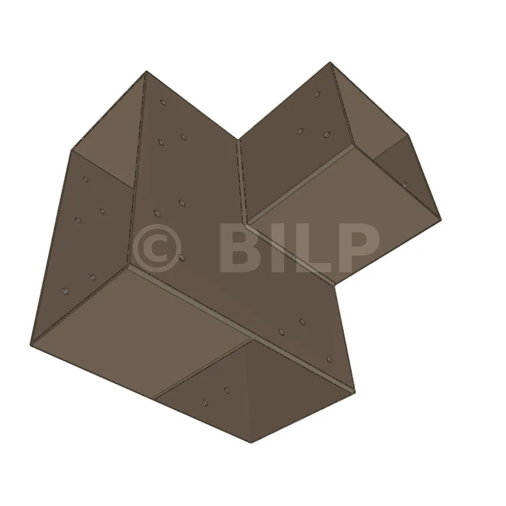 Es wird in einer Außenecke verwendet. Mit diesem Verbinder können Sie einen großen Balken von 240 x 120 mm senkrecht mit einem Balken von 120 x 120 mm verbinden, wobei das Ganze von einem vertikalen Pfosten von 120 x 120 mm getragen wird.