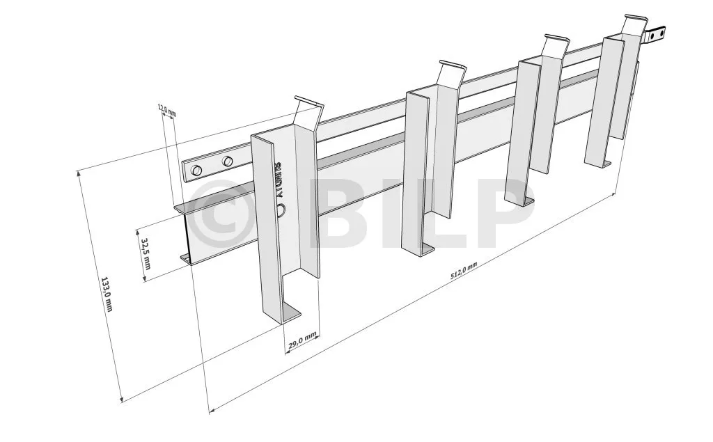 Abstand zwischen den Stützen: Unter der Annahme, dass der Mechanismus zwischen zwei Balken befestigt ist, muss der Abstand zwischen diesen beiden Balken gleich der Länge der Lamellen + 35 mm sein: 2 x 15 mm (Breite des Mechanismuskörpers) + 5 mm Spiel.