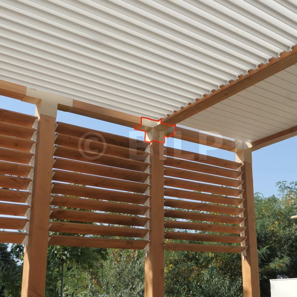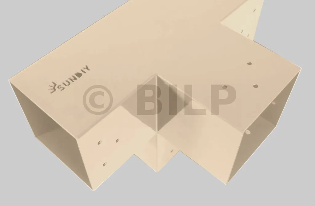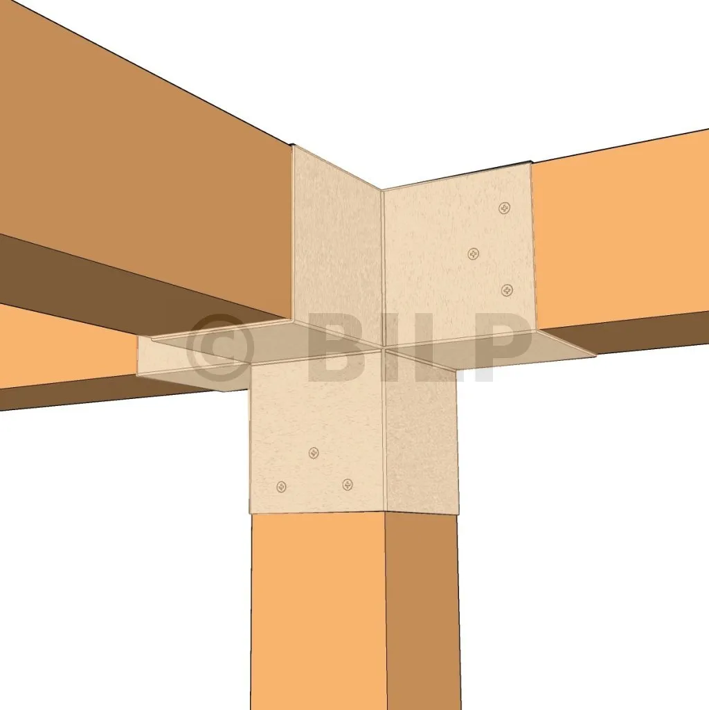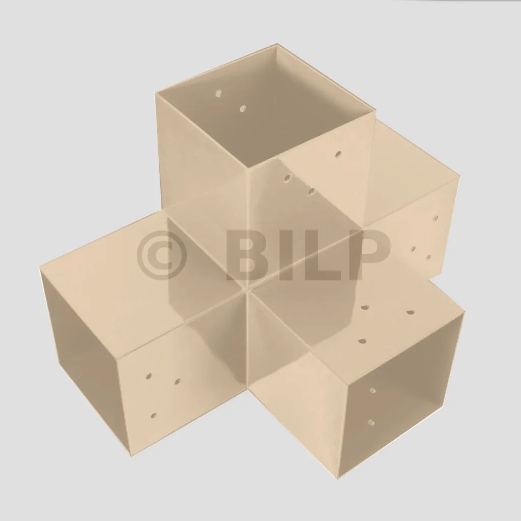 Damit kann eine 120x120mm-Stütze senkrecht zu einem 120x120mm-Chevron angebracht werden, die insgesamt von einem 120x120mm-Vertikaltopf unterstützt wird.
