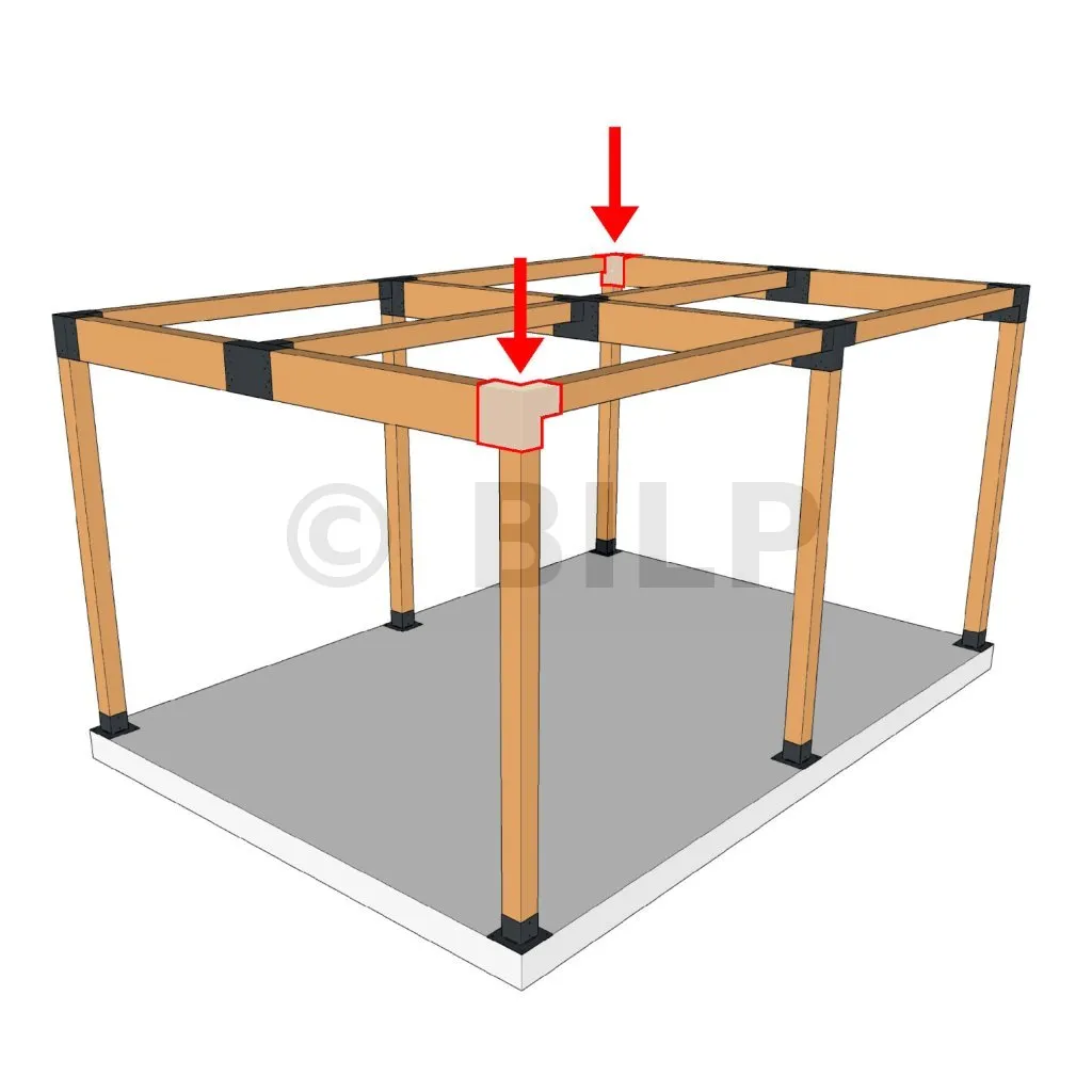 Es wird in einer Außenecke verwendet. Mit diesem Verbinder können Sie einen großen Balken von 240 x 120 mm senkrecht mit einem Balken von 120 x 120 mm verbinden, wobei das Ganze von einem vertikalen Pfosten von 120 x 120 mm getragen wird.