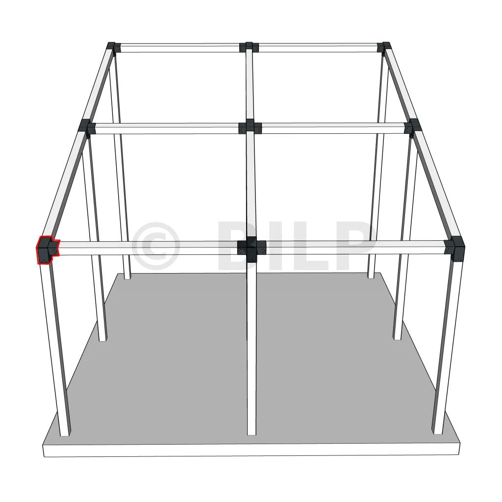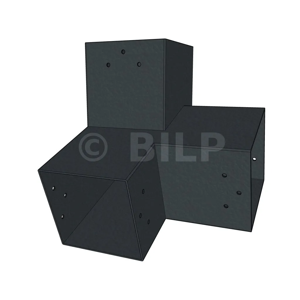 Er wird in einer äußeren Ecke verwendet. Der Verbinder verbindet einen 120×120 mm Balken mit einem weiteren 120×120 mm Balken mit einer Neigung von 20°, getragen von einem senkrechten 120×120 mm Pfosten.