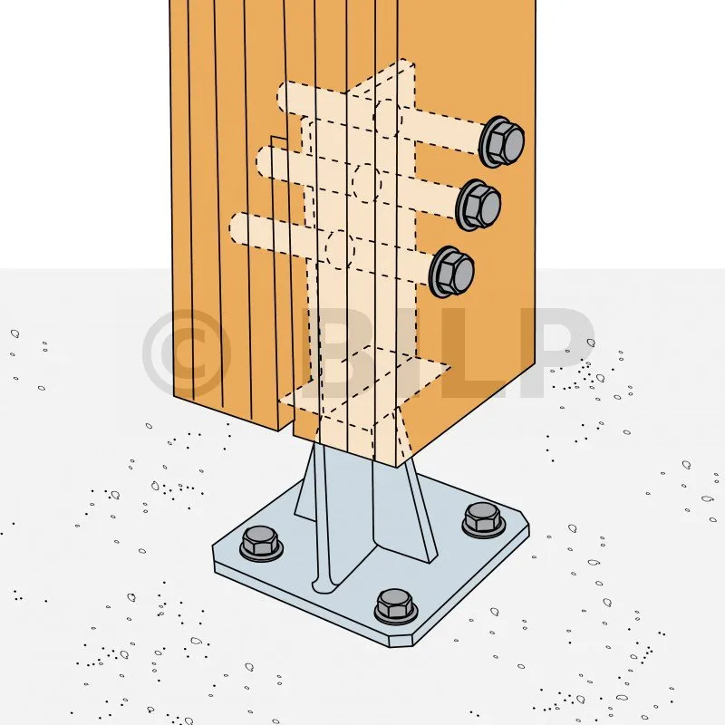 - Holzverbindung auf starrem TrägerAm Pfosten : 1 STD12 ; auf Beton : 4Ø12 (WA-Dübel M12 ; Gewindestange M12), auf Stahl : Bolzen