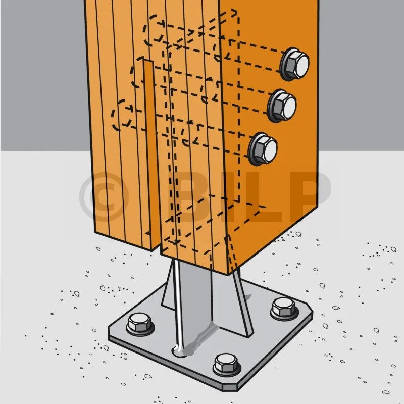 - Holzverbindung auf starrem TrägerAuf Pfosten : 2 STD12 ; auf Beton : 4Ø12 ( Bolzen WA M12 ; Gewindestange M12); auf Stahl : Bolzen