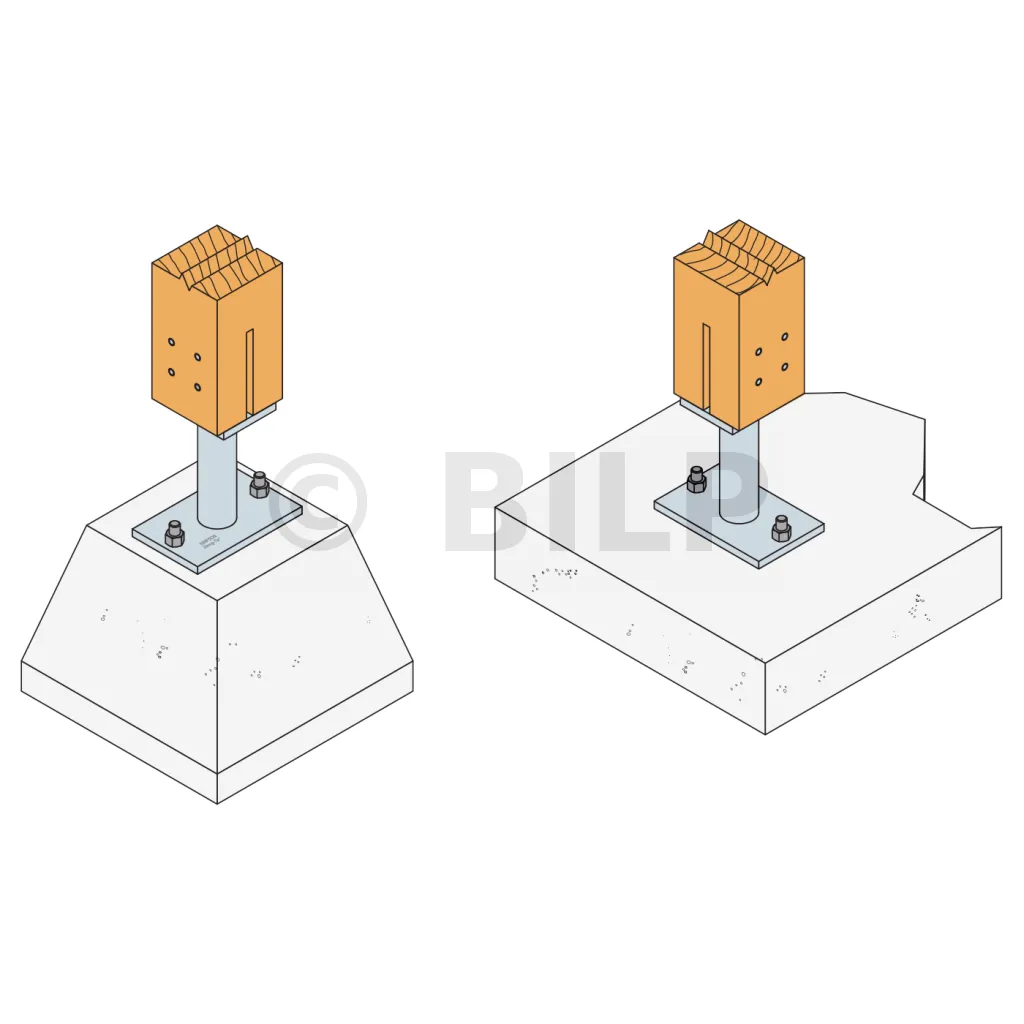 * Beziehen Sie sich auf das Simpson Strong-Tie Verankerungssortiment, um die passende Verankerung auszuwählen. Standardlösungen sind BOAXII, SET-XP, WA, AT-HP, die je nach Betonart, Achsabstand und Randabständen ausgewählt werden sollten.