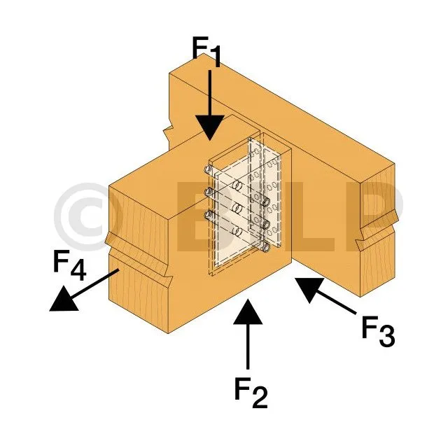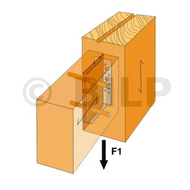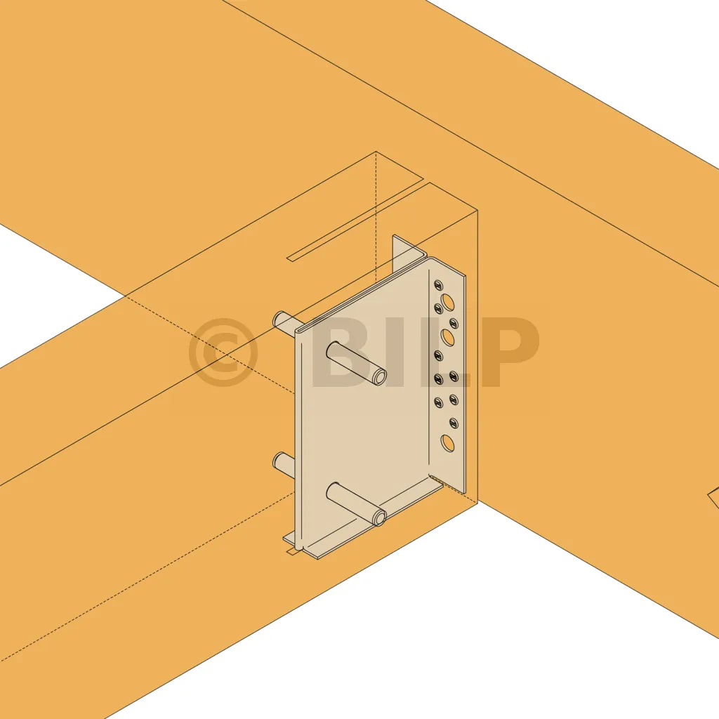 Der verdeckte T-Balkenträger ermöglicht eine unauffällige Montage. Der untere Absatz positioniert den Balkenträger in Bezug auf das Holz und erleichtert so die Montage der Stifte.