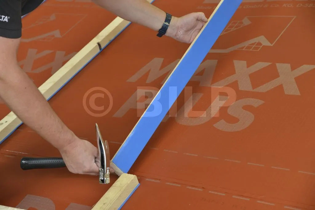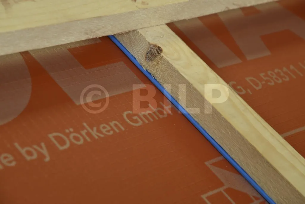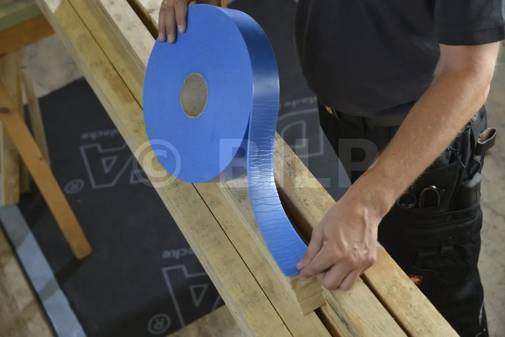 Aufnagelbares Dichtband mit einer selbstklebenden, geschlossenzelligen Polyethylenschaum-Oberfläche in Kombination mit einer integrierten Silikonfolie. Verbessert die Abdichtung zwischen DELTA® -Bahnen an den Perforationen, die durch die Befestigung der Konterlatten und Latten entstehen (kein Sickerphänomen).