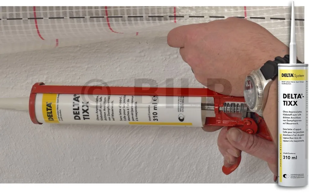 Dauerhaft elastischer Kartuschenkleber zur luftdichten Verklebung von DELTA® Dampfsperren an den seitlichen Stößen.