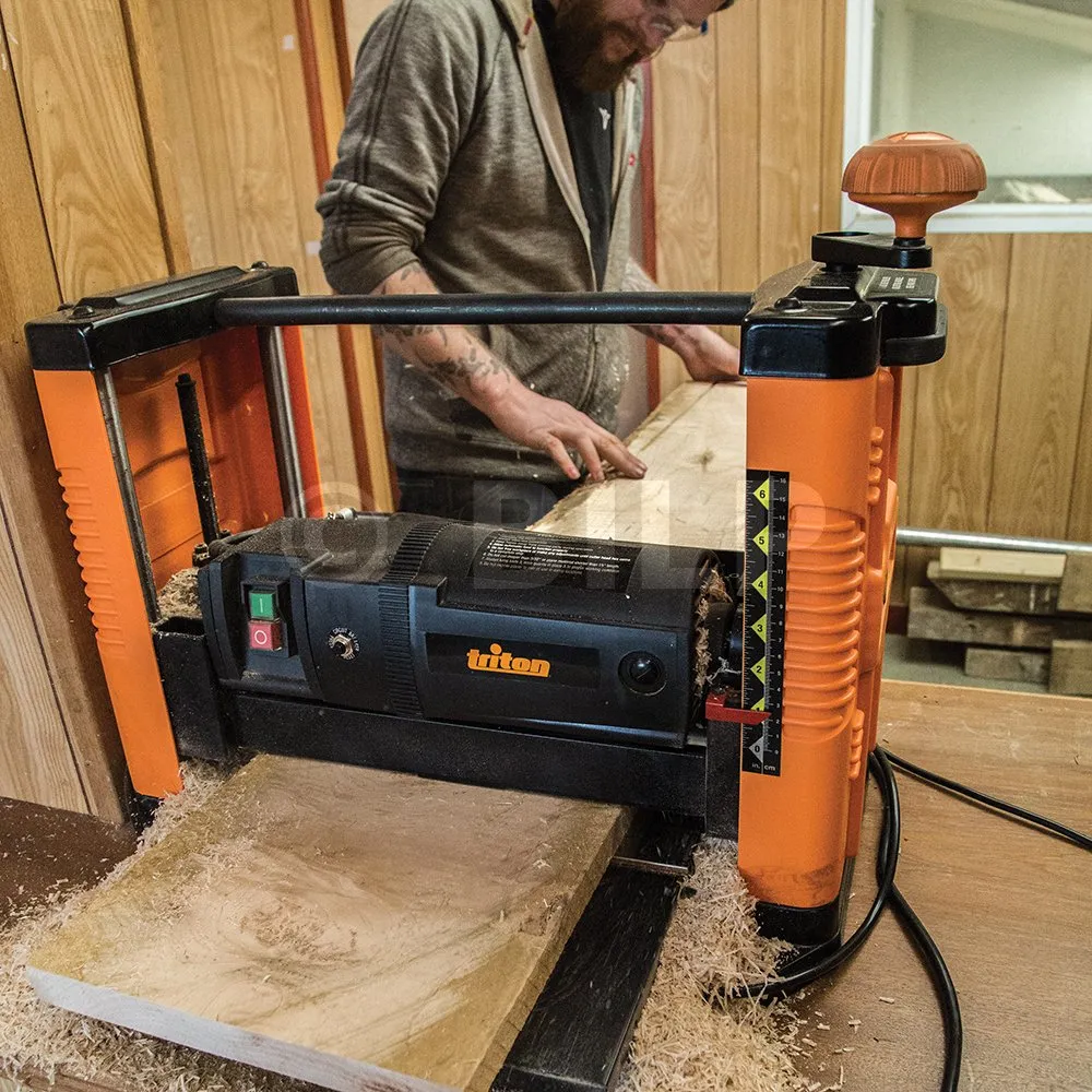 RHochleistungsfähige Dickenhobelmaschine mit einer Hobelbreite von 317 mm (12 1/2 Zoll). 17.500 Schnitte pro Minute. Einfache, präzise Hobeltiefeneinstellungen in 1,6-mm-Schritten. Messerhöhe : 3,2–152 mm. Stufenlose, präzise senkrechte Einstellungen durch Vier-Säulen-Konstruktion. Große Auf- und Abnahmetische bieten verbesserte Auflage für lange Werkstücke. Mit Sicherung für elektrische Sicherheit. Effiziente Staubabsaugung dank Absaugtrichter.