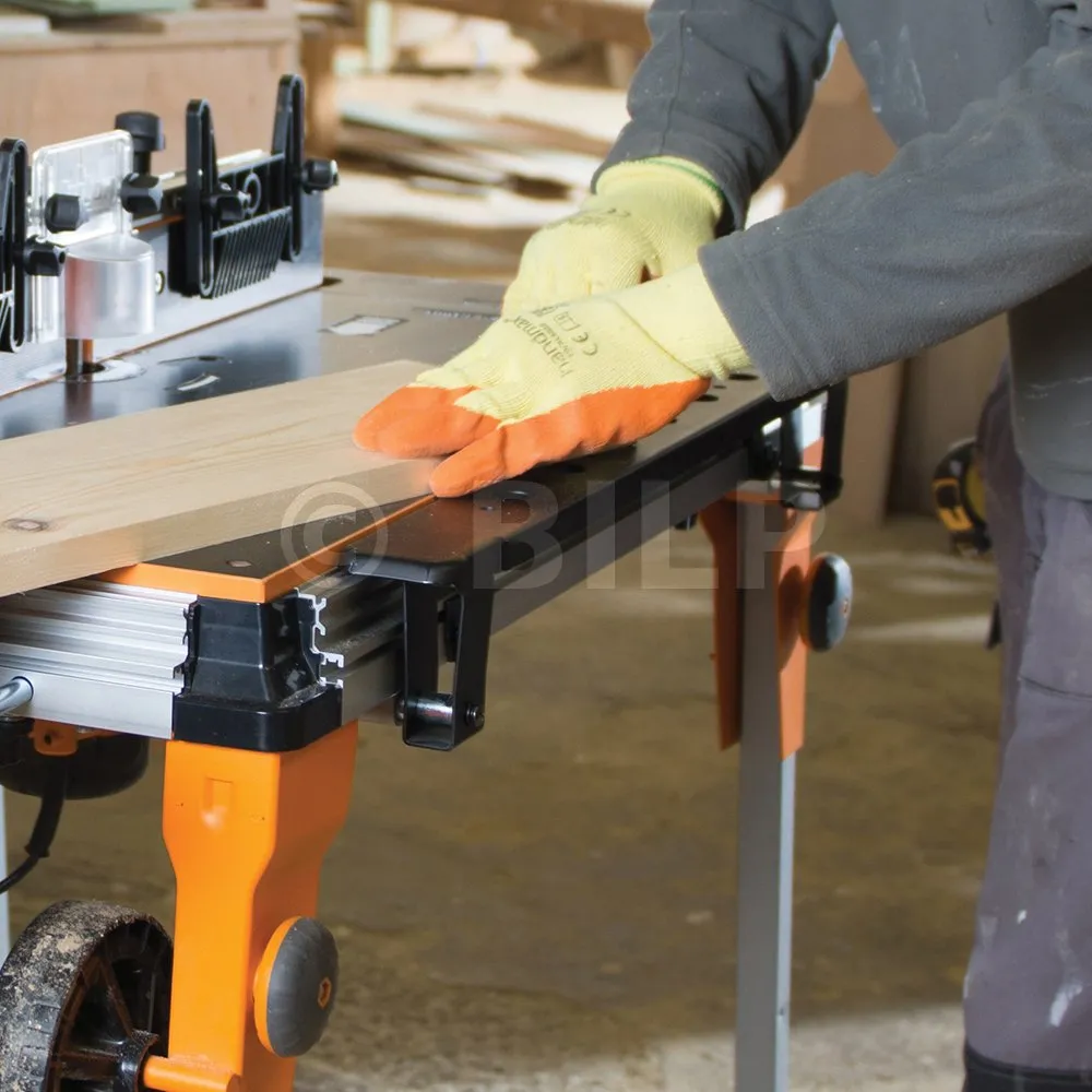 - Seitliche Werkstückstütze zur Bearbeitung längerer Werkstücke.