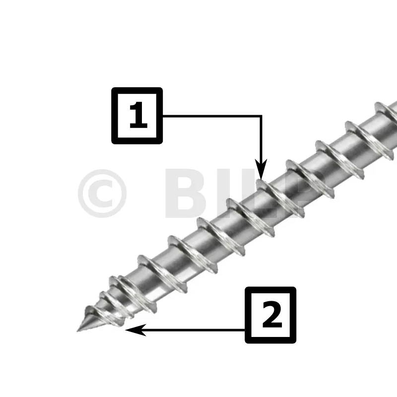 - 40% schneller als herkömmliche Schrauben durch optimiertes Gewinde