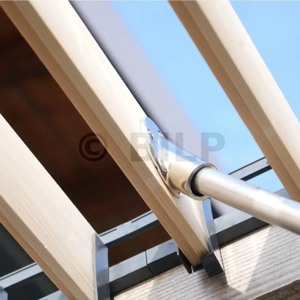 Edehlstahl-Buchstenplatte für die Betätigung der in höhenverstellbaren Lamellen. Die Buchsenplatte ist auf einer Lamelle befestigt und ermöglicht die Aufnahme der abnehmbaren Betätigungsstange. (Die Stange ist in BAUSATZ) geliefert.