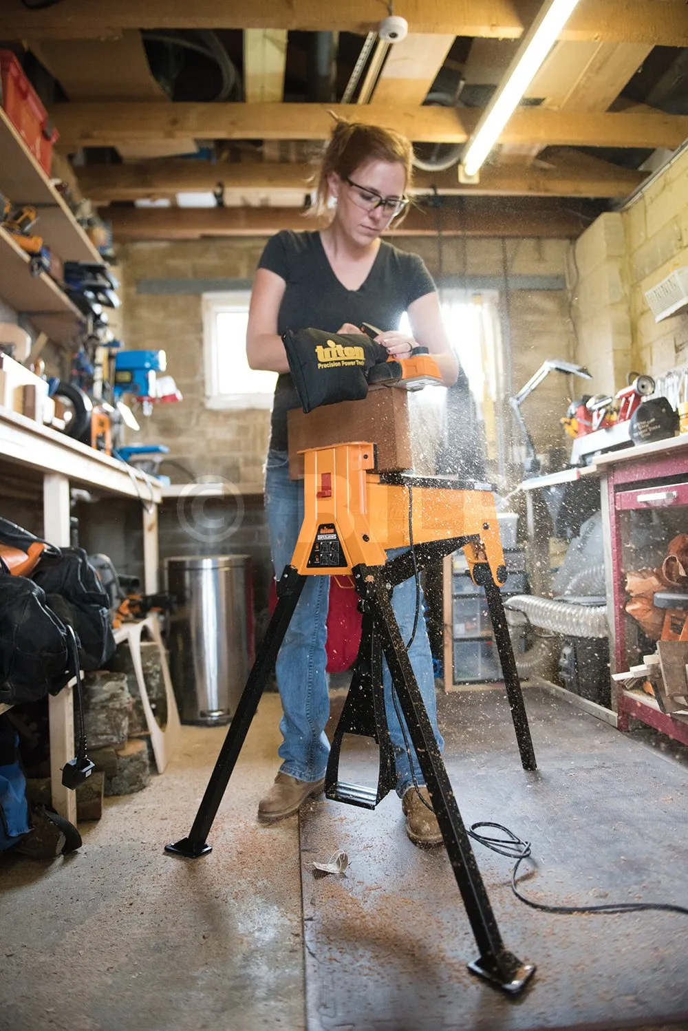- Fuß-Spannmechanismus hält die Hände für optimale Werkstückhandhabung frei