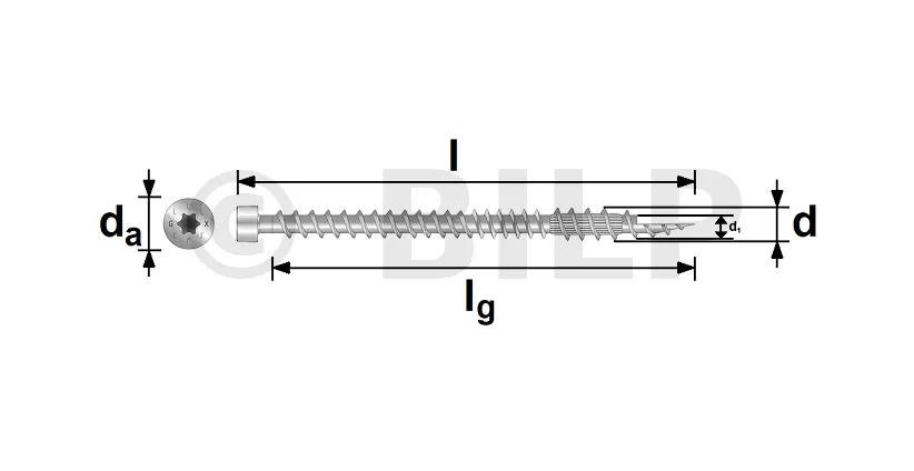 - Bei Klemmschrauben (Teilgewinde) entspricht das Maß t1 der maximalen Dicke, bei der das Gewinde spitzenseitig vollständig im Holz liegt, was eine optimale Klemmung bei der Montage gewährleistet.