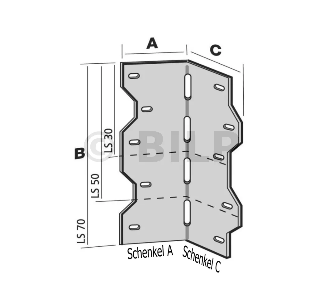 | Referenzen | Abmessungen [mm] | Bohrungen Schenkel A | Bohrungen Schenkel B | |||