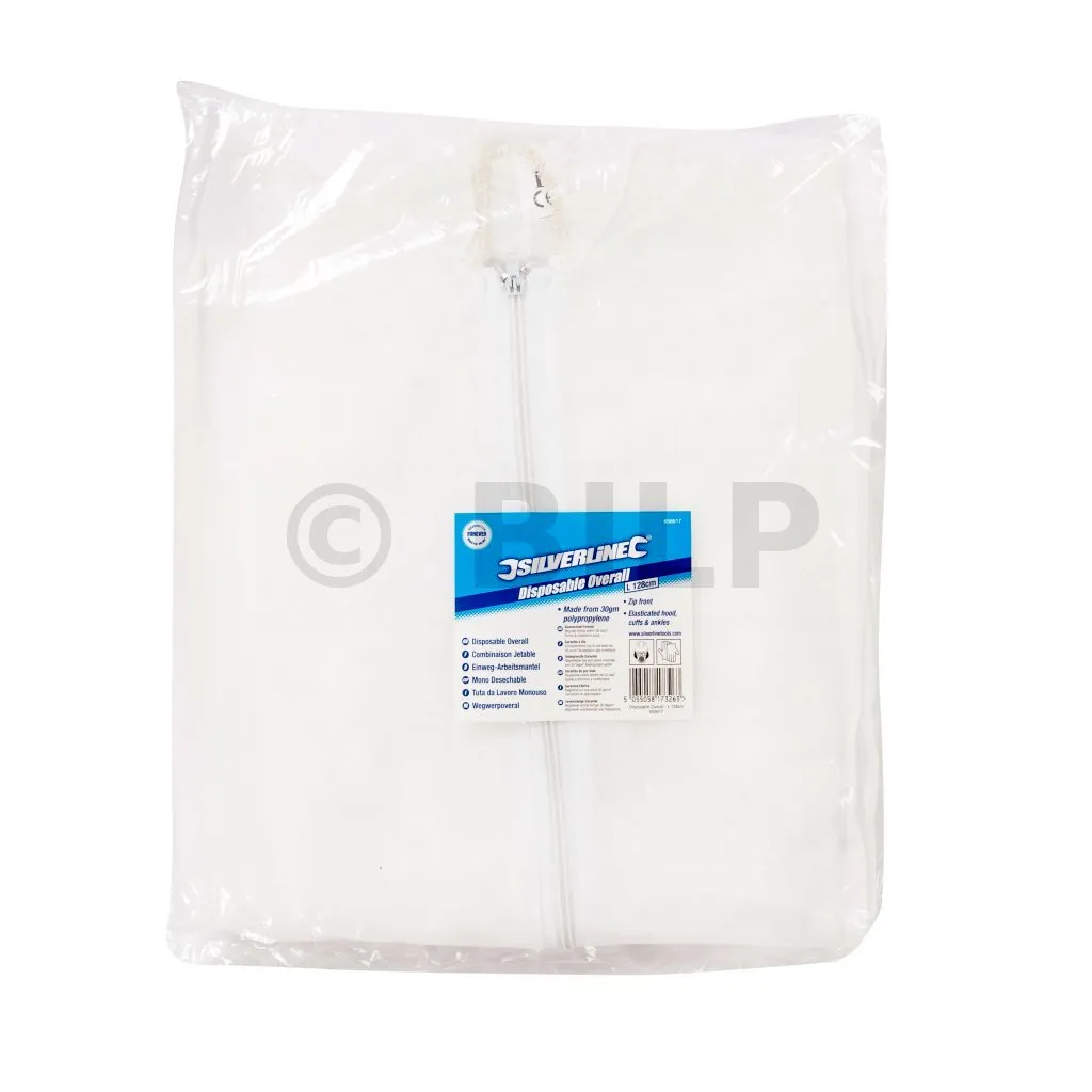 Weißer Einweg-Overall aus Polypropylen. Reißverschluss vorne sowie Kapuze, Arm- und Beinabschlüsse mit Gummizug. Leicht und atmungsaktiv. Für staubige Umgebung, wie z. B. bei Renovier- und Wartungsarbeiten ideal.