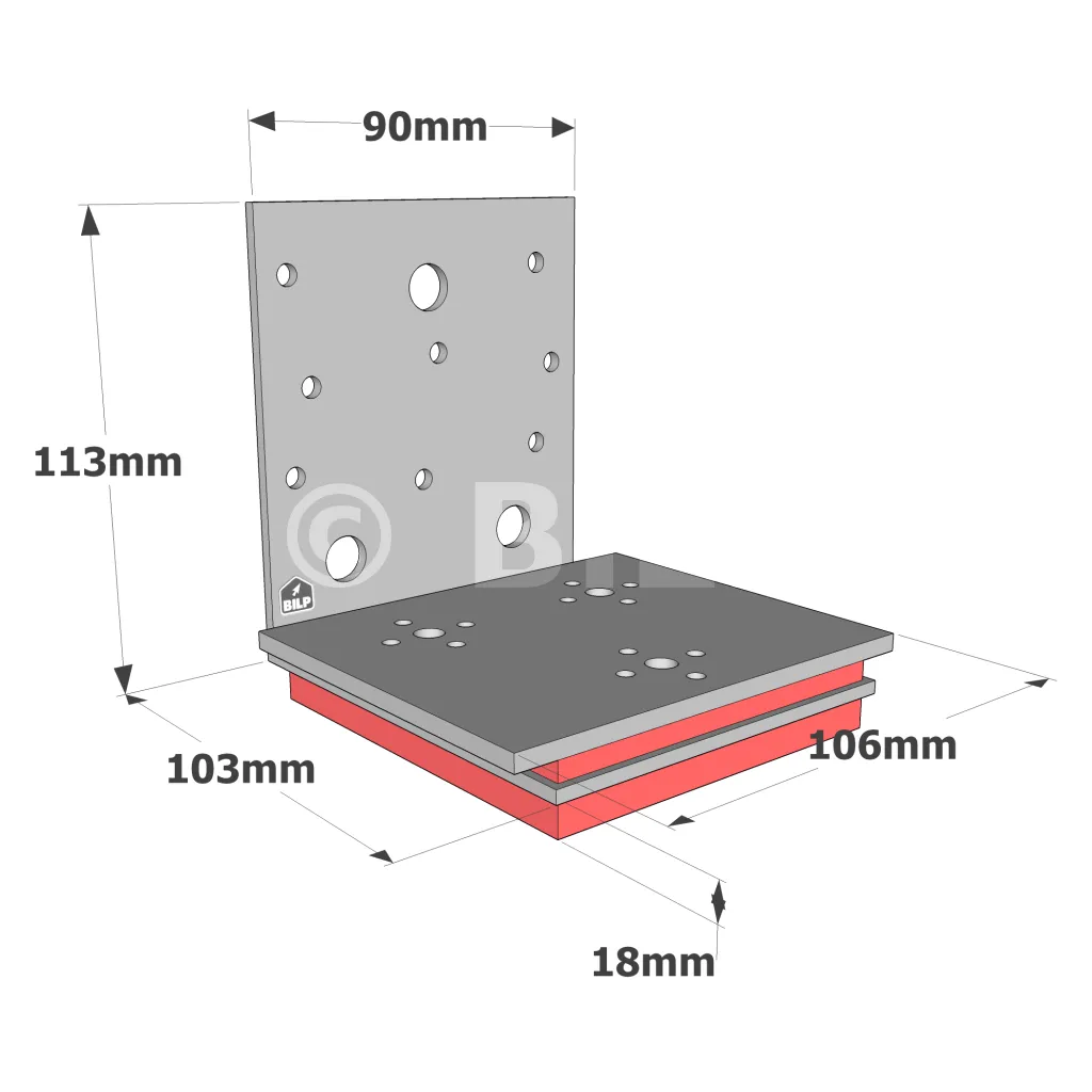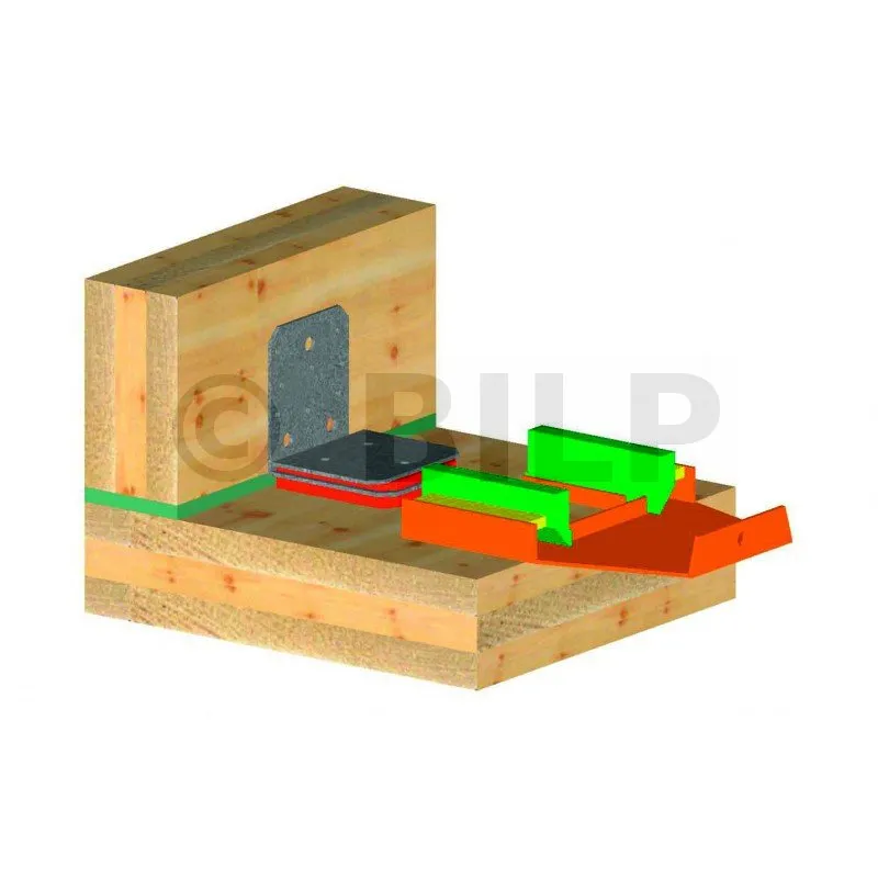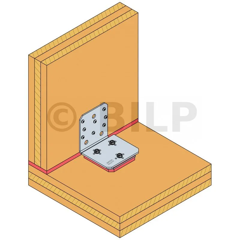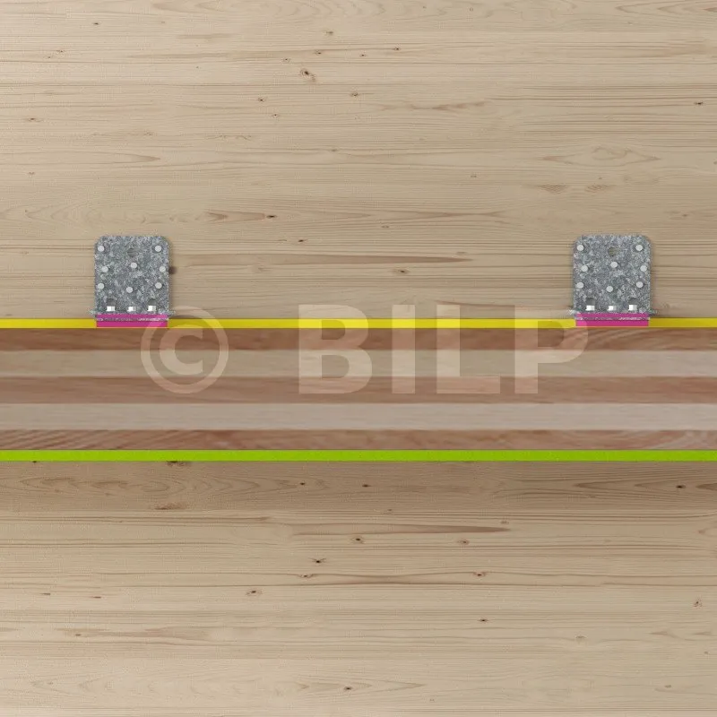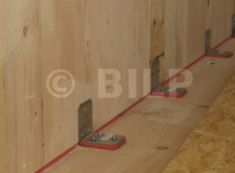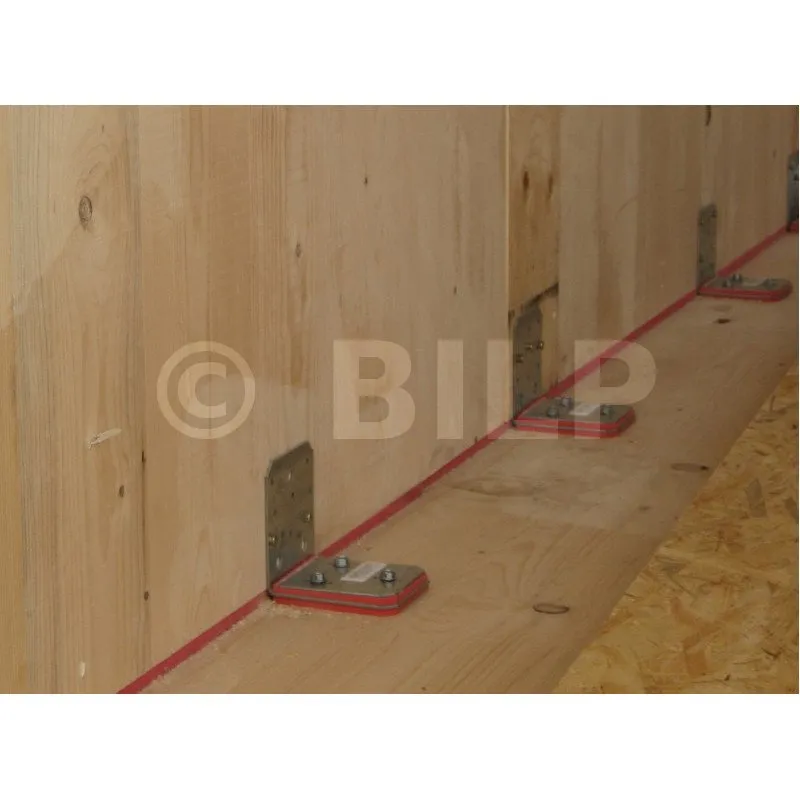 Für absolute Effizienz ist das Vorhandensein eines Sylodyn®-Streifens unter den CLT-Wandpaneelen zwingend erforderlich. Die Auswahl der Sylodyn® Streifen hängt vom Gewicht der Wand ab (siehe Tabelle unten). Zur besseren Montage des ABAI-Winkelverbinders ist eine Montageschablone (Ref. MOABAI) erhältlich. Sie verhindert das Zusammendrücken des Sylodyn®-Streifens unter dem Winkelverbinder.