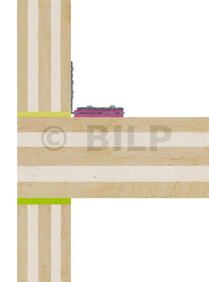 Der Schallschutzwinkel ABAI ist ein innovativer Bügel, weil er einen klassischen Winkelverbinder mit einem schalldämmenden Material, Sylodyn®, kombiniert. Er ermöglicht die Verbindung von Wand- und Bodenelementen aus Mehrschichtplatten (CLT) und garantiert gleichzeitig die Schalldämmung zwischen diesen Bauteilen dank eines 12 mm breiten Streifens aus Sylodyn®, der unter dem Winkel vorinstalliert ist.