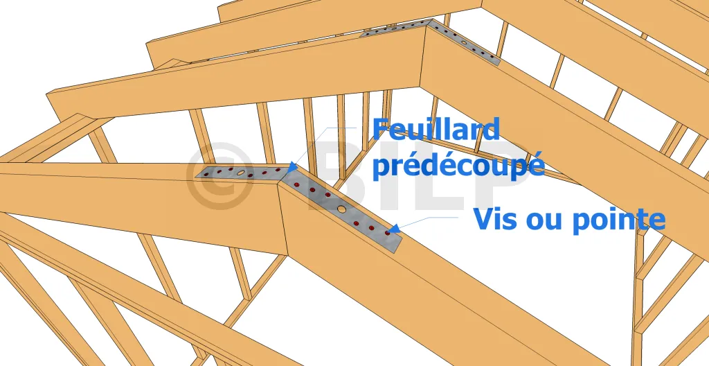 | Feuillard prédécoupé Longueur (LTSA) 457 mm | Un feuillard par assemblage et fixé au-dessus des têtes de chevrons. | Commander |