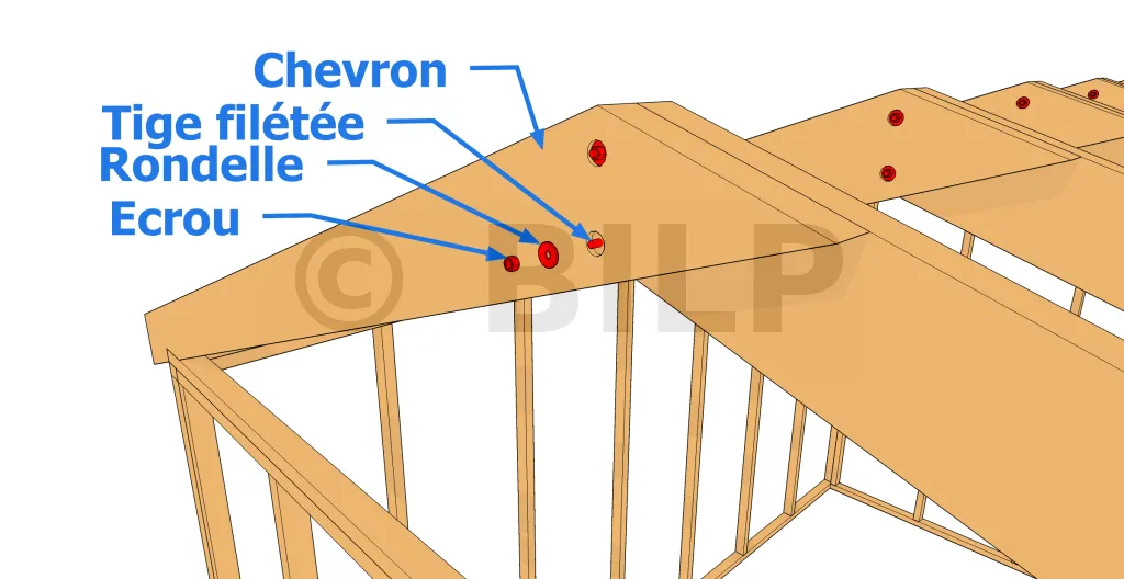 | Tige filetée D10 x L120 accompagnée de 2 écrous hexagonaux et 2 rondelles plates | Solidarise les têtes des chevrons | Au minimum 2 tiges filetées par tête de chevron | Commander | |