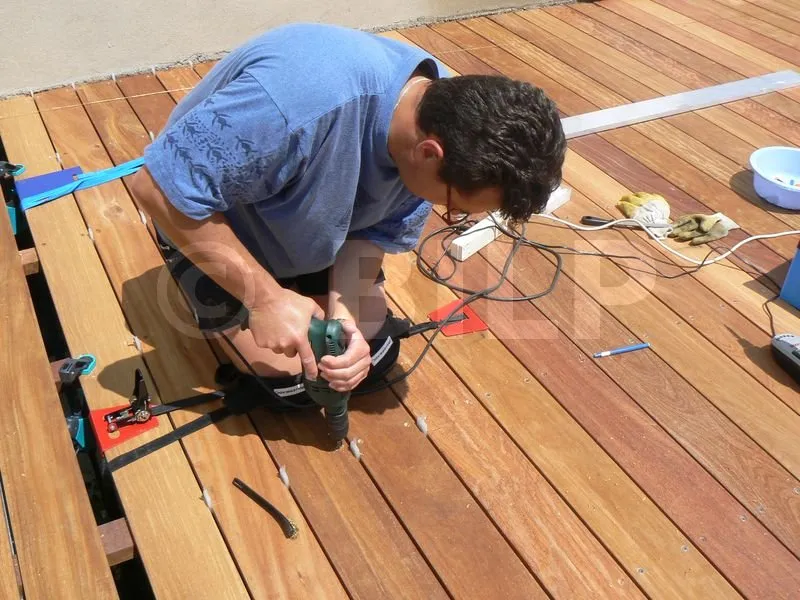 Bei Dicken über 20 mm werden Sie jedoch weiterhin Unterlegbleche aus Holz verwenden, bei denen Restholzterrassendiele oder Lagerhölzer verwendet werden. Sie müssen jedoch weiterhin einen PVC-Keil unter der Holzunterlage einführen, um zu verhindern, dass diese mit Feuchtigkeit in Berührung kommt.